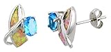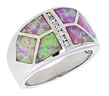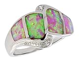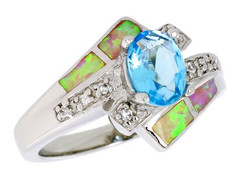 Sterling Silver, Synthetic Pink Opal Ring, w/ Oval Shape Blue Topaz CZ & Brilliant Cut CZ stone Accents, 1/2" (13 mm) wide