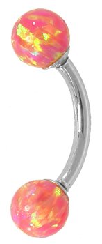 GOLD CURVED BARBELL BODY JEWELRY. This opal curved barbell is absolutely stunning. Beautifully hand-crafted from Solid 14kt Gold, this gold banana barbell is embellished with two simulated Opals. Simulated Opals are amazingly more radiant and colorful than natural Opals. This curved barbell is available in 14kt White Gold or 14kt Yellow Gold and in various lengths to suit your body piercing. We carry the finest line of high-end gold body piercing jewelry. Our gold body jewelry is crafted from nickel-free SOLID 14kt Gold. Do not confuse our gold barbells with those found on other online body piercing jewelry stores; they are not plated and are not crafted from cheap imported gold, as you may find at most other online stores. All of our gold body jewelry is handcrafted in the USA. This item ships in 1-3 days. Barbell Size: 14 Gauge Barbell Length: 5/16" (7.9mm) NOTE: Please make sure to select your size carefully.14G 5/16" Pink Opal Solid 14kt White Gold Curved Barbell - 5mm Opals